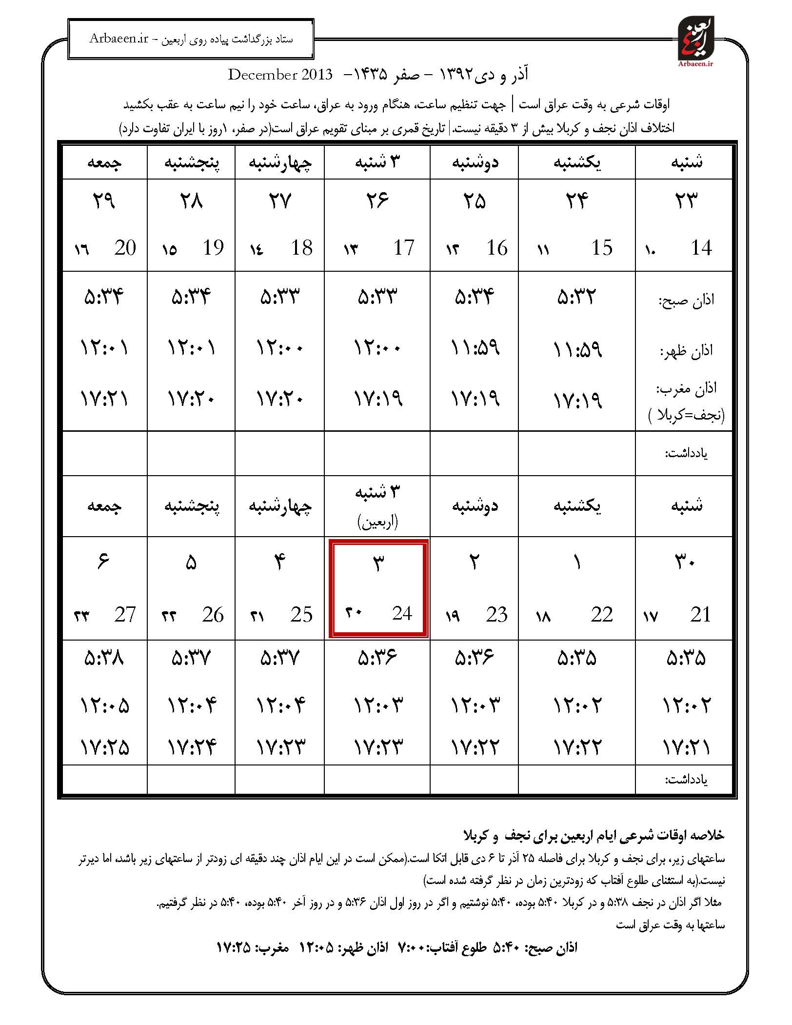 اختلاف اذان نجف و کربلا بیش از 3 دقیقه نیست.| تاریخ قمری بر مبنای تقویم عراق است(در صفر، 1روز با ایران تفاوت دارد)